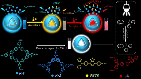 在本研究中,作者选择具有非平面构象和聚集诱导发光(AIE)特性的刚性大环K-1作为人工光捕获平台的能量供体,而非环状AIEgenK-2用于对比研究。在水溶液中,蓝色发光的K-1与橙色荧光的受体PBTB之间建立了高效的一步能量传递过程,能量转移效率(ΦET)高达82.6%。值得注意的是,该体系可以轻松实现明亮的白光发射。此外,通过从AIEgens到PBTB的能量转移,然后进一步将捕获的能量传递到最终的红色发光受体Z1,构建了三元能量共振传递系统,实现了高效的两步连续能量转移。当K-1/PBTB/Z1组装体的比例调节到1000:40:14时,最佳ΦET为66.4%。更重要的是,发现基于大环K-1的人工光捕获平台在交叉脱氢偶联反应中表现出高效的光催化活性。因此,这种超分子组装策略使大环AIEgen成为构建高效光催化人工光捕获平台的理想材料。