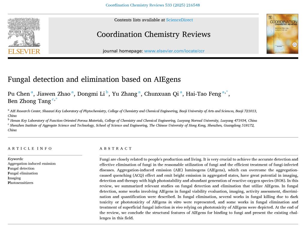 近日,beat365官网化学化工学院、AIE(聚集诱导发光)研究中心陈璞博士在国际著名期刊Coordination Chemistry Reviews(SCI一区Top期刊,影响因子20.3)发表题为“Fungal detection and elimination based on AIEgens”的综述论文。陈璞博士为论文第一作者,beat365官网是第一通讯单位,冯海涛教授和唐本忠院士为论文通讯作者。