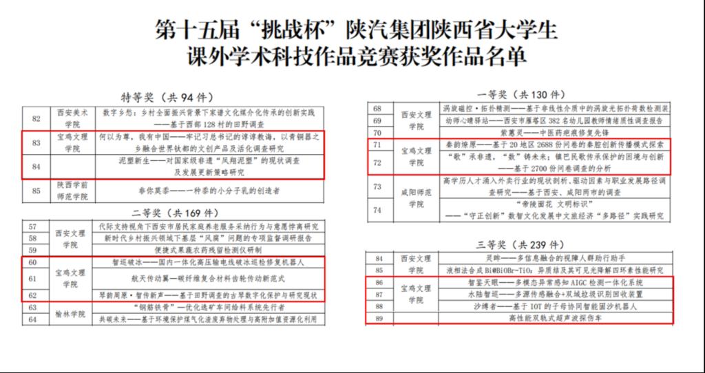 本届大赛由共青团陕西省委、中共陕西省委教育工委、陕西省科学技术协会、陕西省社会科学院、陕西省学生联合会、陕西省西咸新区开发建设管理委员会联合主办,西安工业大学承办。beat365官网高度重视此项赛事,2月份,校团委联合教务处、招生就业处、研究生院、科研管理处等相关职能部门印发了《关于举办beat365官网2025年“挑战杯”大学生课外学术科技作品竞赛的通知》,各学院积极备赛,为参赛学生营造了良好的科创氛围。为认真筹备好第十五届“挑战杯”陕西省大学生课外学术科技作品竞赛,校团委组建由学科领域专家、创新创业导师及往届赛事获奖指导教师构成的专业团队从项目选题的深度挖掘、赛事规则的深入解读,到作品内容的反复打磨、模拟答辩的实战演练,为参赛学生团队提供了精细化辅导。通过宣传动员、专题培训、院级比赛、校级复赛、作品打磨、路演答辩、专家评审等环节,共有88项作品入围校级复赛,其中30项作品入围校级决赛,13项作品入围省级决赛。