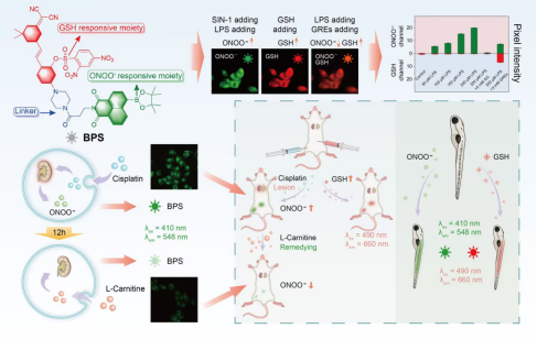 该研究报道了一种新型双位点荧光化学传感器(BPS),实现了药物性急性肾损伤(DIAKI)中过氧亚硝酸盐(ONOO⁻)与谷胱甘肽(GSH)的双通道实时监测,为氧化应激相关肾脏疾病的机制研究和治疗提供了创新工具。BPS通过独立激发/发射波长(ONOO⁻:410 nm/548 nm;GSH:490 nm/660 nm)实现两种生物标志物的同步精准检测,避免光谱重叠干扰。该传感器具有高灵敏度与选择性,检测限达181 nM(ONOO⁻)和2.42 μM(GSH),显著优于现有检测手段,并在复杂生物环境中展现强抗干扰能力。本研究首次在小鼠模型和HK-2细胞中实时追踪顺铂诱导的DIAKI病理进程及治疗恢复阶段,揭示ONOO⁻累积与GSH耗竭的时空调控规律,提出通过可视化GSH/ONOO⁻氧化还原平衡干预疾病进程的创新思路,为精准诊疗奠定基础。药物性急性肾损伤(DIAKI)是全球住院患者常见并发症,临床数据显示其死亡率高达30%-70%。传统检测方法依赖侵入性采样和延迟性生化指标,难以捕捉氧化应激动态变化。该研究报道的BPS传感器突破了这一瓶颈,首次证实DIAKI进程中ONOO⁻爆发性生成与GSH持续性耗竭的时空关联性,为靶向干预提供理论依据。在小鼠模型中验证了BPS对顺铂毒性及抗氧化剂治疗效果的实时评估能力,显著提升诊疗时效性。该传感器具备微创检测潜力,有望开发为无创试剂盒或植入式监测设备,推动床旁诊断(POCT)发展。(科研管理处、化学化工学院 文、图/周妮妮 审核/王晓玲、胡登卫)