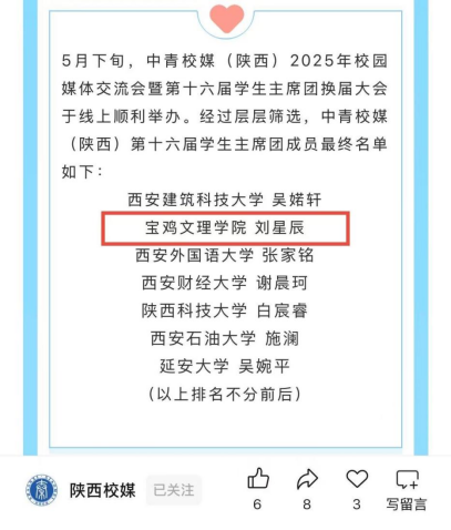 近日,中青校媒(陕西)2025年校园媒体交流会暨第十六届学生主席团换届大会于线上举办,beat365官网文学与新闻传播学院2022级广播电视编导专业学生刘星辰当选新一届主席团成员。