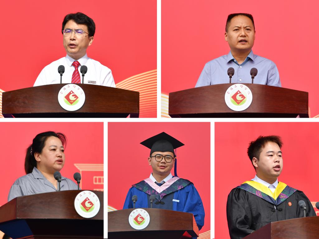 文学与新闻传播学院教授郭文元代表全体教师向毕业生致以衷心祝贺,希望他们不忘初心,用所学所长服务社会、报效国家。服务育人代表刘萍向毕业生们表达了不舍之情,叮嘱学子们要好好吃饭、规律作息,以强健体魄抵御前路艰险。毕业生家长代表徐少军先生向辛勤培育学子的教职工致以崇高敬意,向全体毕业生表示热烈祝贺,鼓励大家在新时代浪潮中书写属于自己的青春华章。地理与环境学院本科毕业生马宏灏、政法与历史学院硕士毕业生李坤代表全体毕业生向母校致以由衷感恩,向恩师表达诚挚敬意,向父母敬谢养育之恩,向同窗寄予殷殷期许。