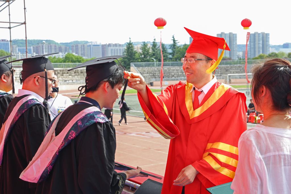 郭霄鹏为硕士学位获得者、学士学位获得者学生代表扶正流苏并颁授学位证书。