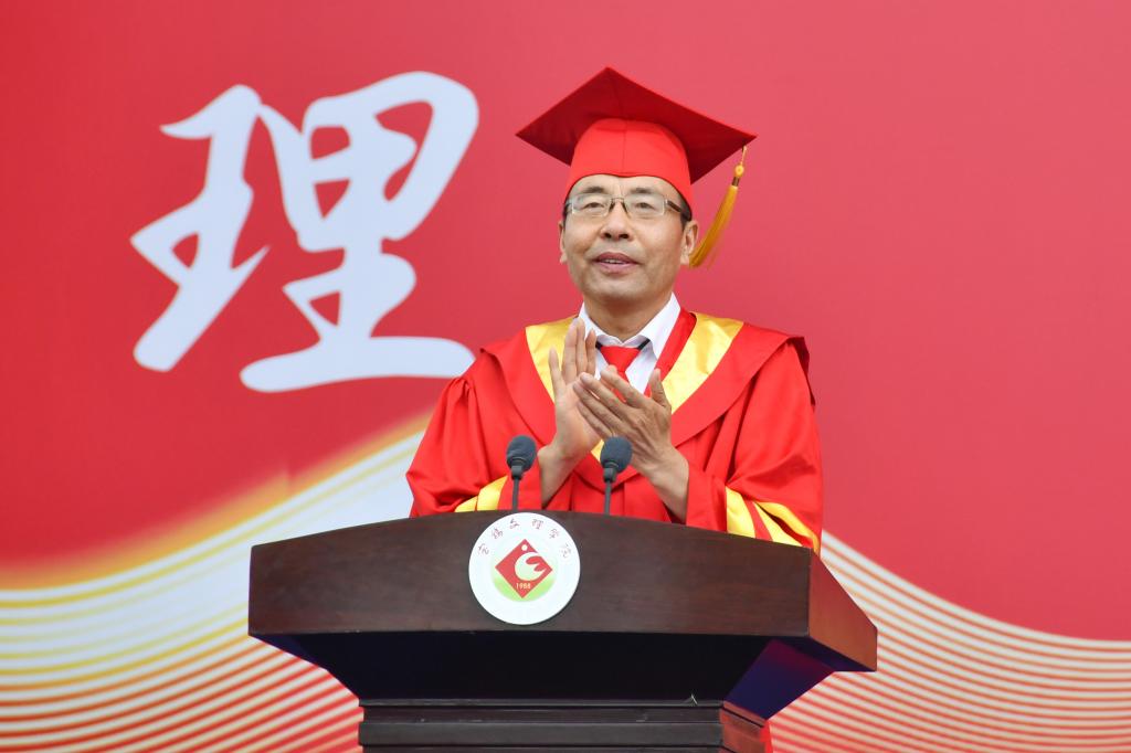 郭霄鹏指出,2025届全体毕业生在校期间刻苦学习、积极进取,勇于创新、追求卓越,无私奉献、热心公益,心系国家、感恩社会,将“博文明理、厚德尚能”的校训精神深深融入血脉,用奋进之笔绘就理想信念,用青春活力展现使命担当。他代表学校,感谢同学们为学校改革发展作出的贡献。他向毕业生们提出三点希望:一是坚定远大理想,厚植爱国情怀。要牢记习近平总书记“理想指引人生方向,信念决定事业成败”的谆谆教诲,把爱党报国作为毕生追求,将个人理想融入国家和民族事业,让青春之花绽放在祖国最需要的地方。二是坚持终身学习,练就过硬本领。要树立梦想从学习开始、事业靠本领成就的观念,不断提升专业能力和认知水平、拓展认知边界和思维格局,在赓续中国梦的伟大实践中创造属于自己的荣耀。三是磨炼坚强意志,砥砺奋斗品格。要牢记习近平总书记“千磨万击还坚劲,任尔东西南北风”的叮嘱,保持“风雨不动安如山”的定力,以“不破楼兰终不还”的韧劲,在青春赛道上跑出最好成绩。最后,他祝愿所有毕业生一路芬芳、一路辉煌,前程似锦、万事顺意。