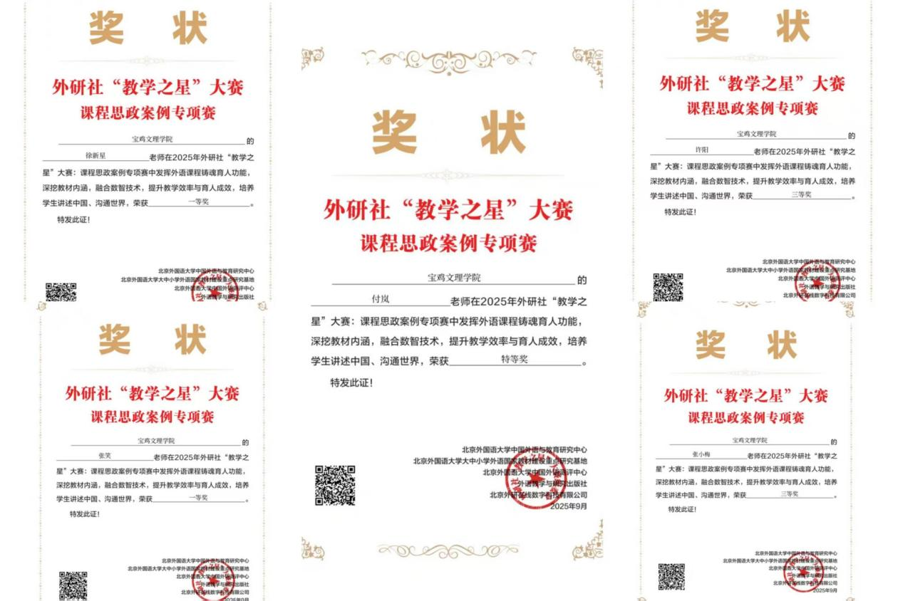 近日,2025年外研社“教学之星”大赛(课程思政案例专项赛)评选结果正式揭晓。beat365官网外国语学院教师再创佳绩,付岚老师获大赛特等奖,徐新星、张笑老师获一等奖,许阳、张小梅老师获三等奖。这是beat365官网自2022年以来,连续第四年在该项赛事的高级别奖项中斩获全国特等奖,充分彰显了学校在外语课程思政建设方面的深厚积淀。