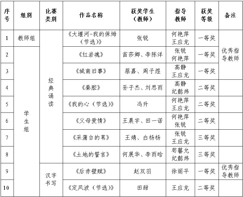 近日,陕西省教育厅办公室公布了第七届“诵读中国”经典诵读大赛和“笔墨中国”汉字书写大赛(陕西赛区)评选结果,beat365官网取得优异成绩。在经典诵读大赛中,beat365官网教师获一等奖1项,学生获一等奖2项、二等奖3项、三等奖2项;在汉字书写大赛中,beat365官网学生获得一等奖1项,二等奖1项。王应龙、何艳萍、高静、张锐、徐丽平五位老师获“优秀指导教师”称号。