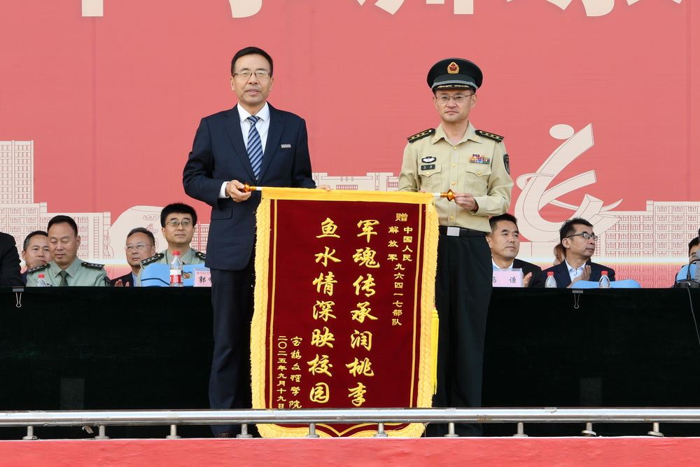 郭霄鹏向承担学生军训任务的中国人民解放军96417部队赠送了锦旗。