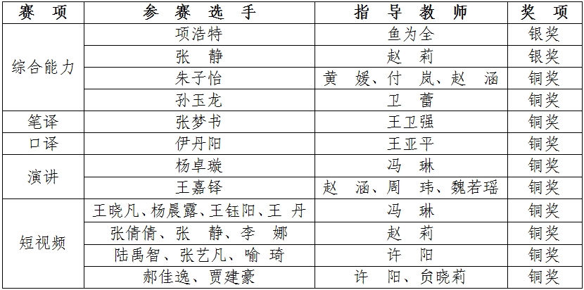 校赛由教务处主办,外国语学院承办,自7月启动以来,来自外国语学院、经济管理学院、教育学院、电子电气工程学院、数学与信息科学学院、政法与历史学院、化学与材料工程学院及研究生院共100余人次报名参与,共产生金奖4项,银奖11项,铜奖18项。其中,演讲赛项2名、综合能力赛项4名、笔译赛项1名、口译赛项1名选手和短视频赛项4个团队及其作品进入省赛。