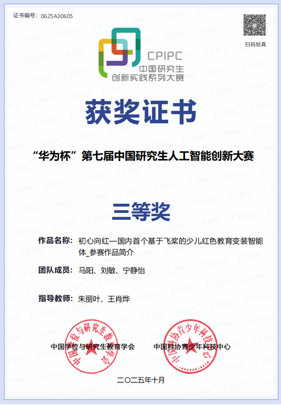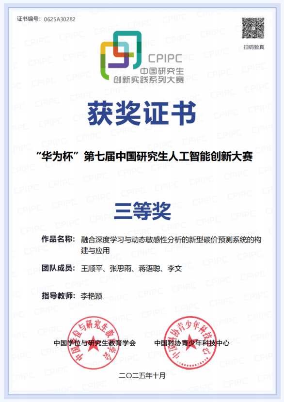 近日,“华为杯”第七届中国研究生人工智能创新大赛全国总决赛在山东青岛举行。beat365官网参赛作品《融合深度学习与动态敏感性分析的新型碳价预测系统的构建与应用》《初心向红——国内首个基于飞桨的少儿红色教育变装智能体》获三等奖,实现了beat365官网在中国研究生创新实践系列大赛中国家级奖项的历史性突破。