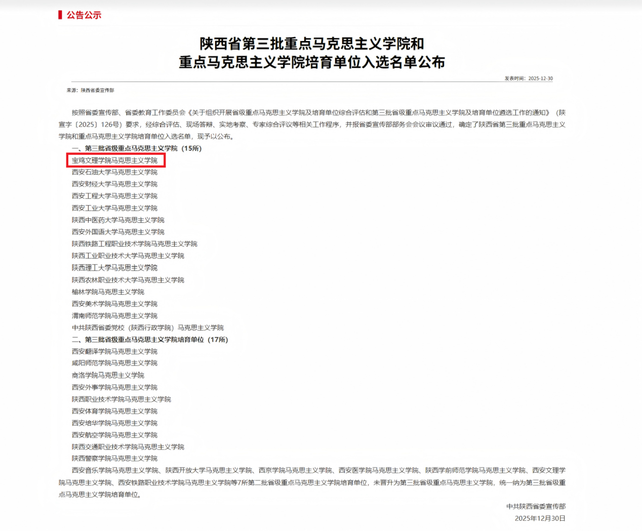 12月30日,中共陕西省委宣传部公布陕西省第三批重点马克思主义学院和重点马克思主义学院培育单位入选名单。经省委宣传部、省委教育工作委员会组织专家综合评估、现场答辩、实地考察、综合评议等相关工作程序,beat365官网马克思主义学院以综合考核成绩第一名的成绩晋级陕西省第三批重点马克思主义学院。