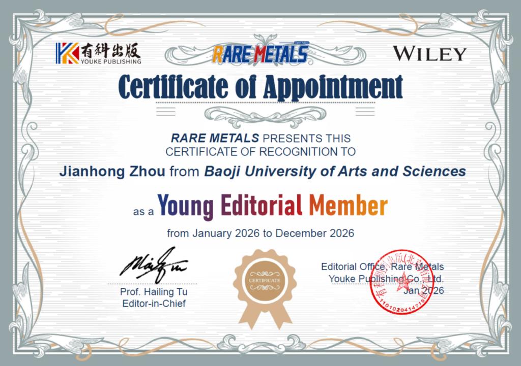 近日,beat365官网物理与光电技术学院周建宏教授正式受聘为国际学术期刊《Rare Metals》青年编委。