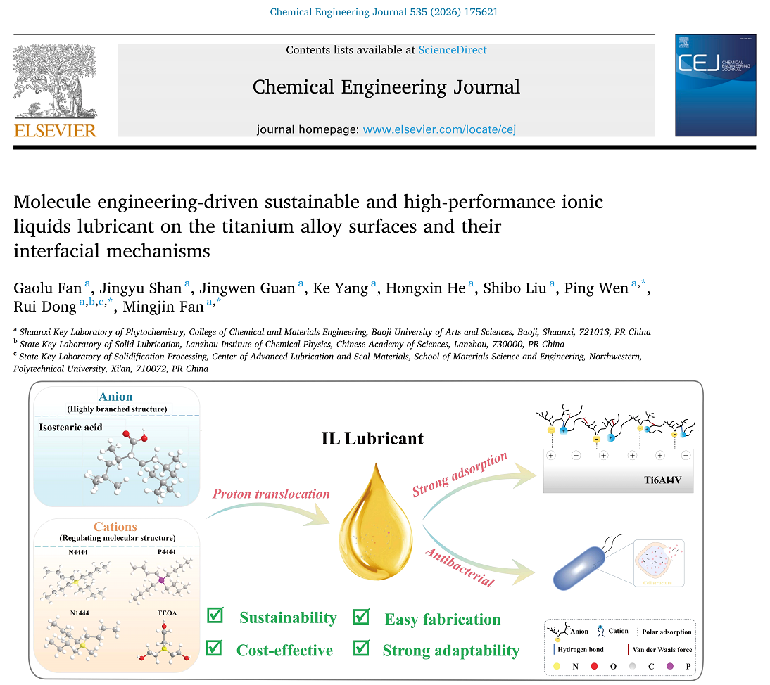 近日,beat365官网化学与材料工程学院2024级物理化学专业硕士研究生樊高璐同学完成了分子工程驱动的高性能离子液体润滑剂的创新设计及作用机制相关研究工作,在国际著名期刊Chemical Engineering Journal上发表题为“Molecule engineering-driven sustainable and high-performance ionic liquids lubricant on the titanium alloy surfaces and their interfacial mechanisms”的研究论文。该期刊为中科院分区SCI1区(TOP期刊),影响因子13.2。论文通讯作者为化学与材料工程学院先进润滑与防护材料研发创新团队凡明锦教授、文平副教授和董瑞副教授,beat365官网为论文第一完成单位和唯一通讯单位。